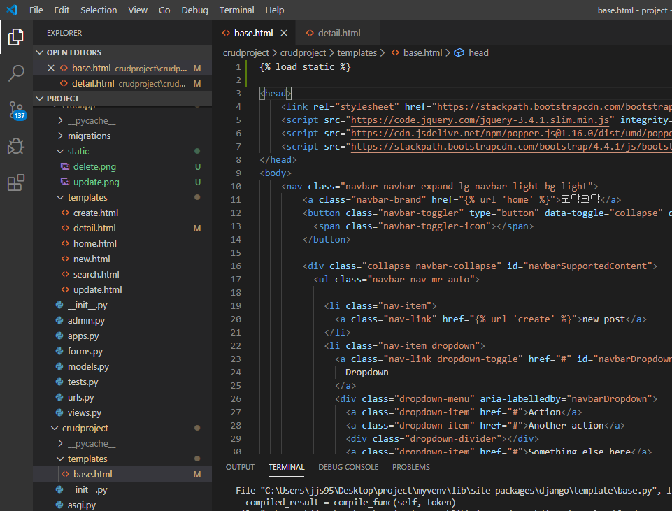 base.html은 모든 html 파일에서 사용하니 base.html에 적어주었습니다.