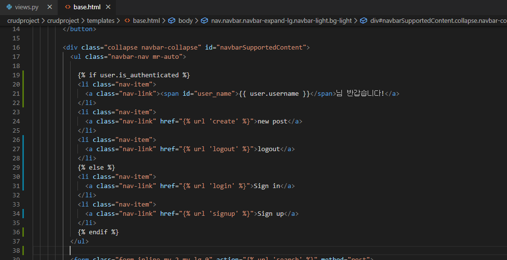 로그인이 되어있으면 user.username과 logout, 그리고 글을 쓸 수 있게 하고