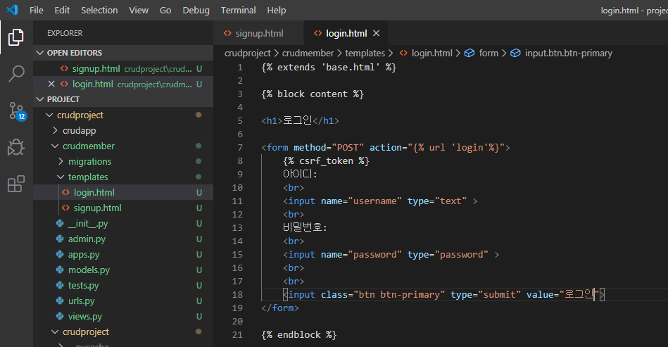 templates폴더에는 login.html과 signup.html 파일을 만들어 줍니다.