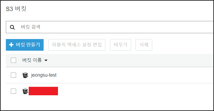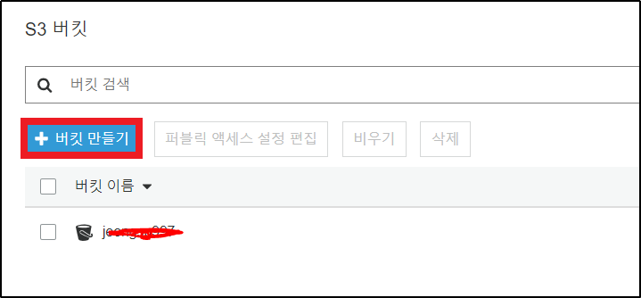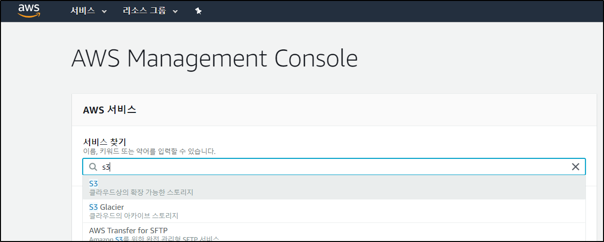 aws에 가입하여 콘솔에 로그인을 한 뒤 s3버킷을 검색하여 들어가 줍니다.