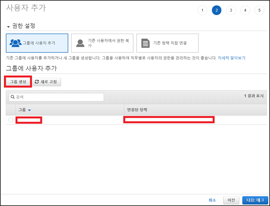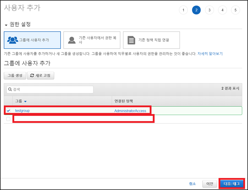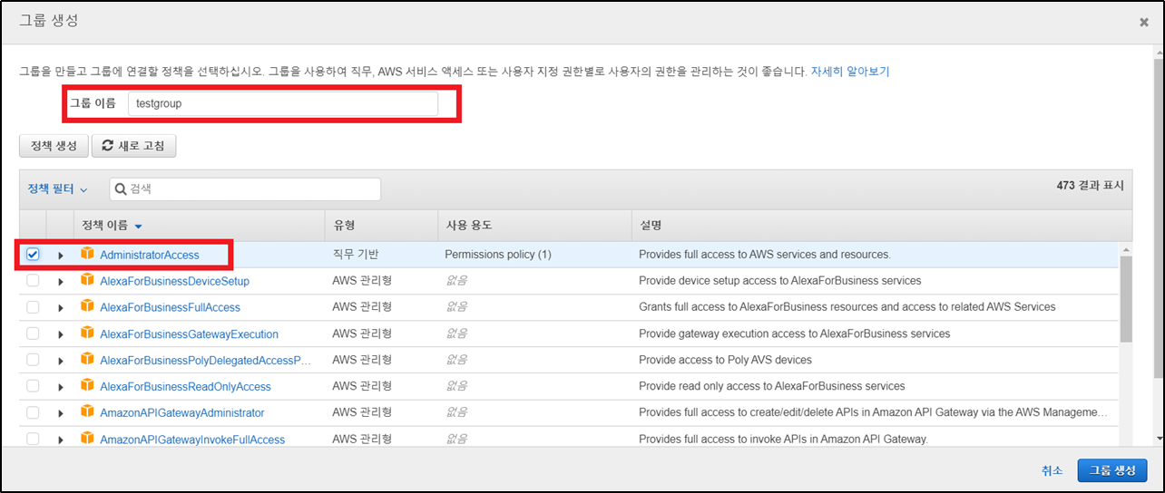 그룹 이름을 정하고 제일 첫 번째인 admin을 선택 후 그룹 생성