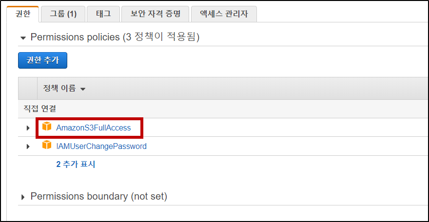 저번 강의 때 만들었던 사용자에게 S3버킷 권한을 추가해 주어야 합니다.