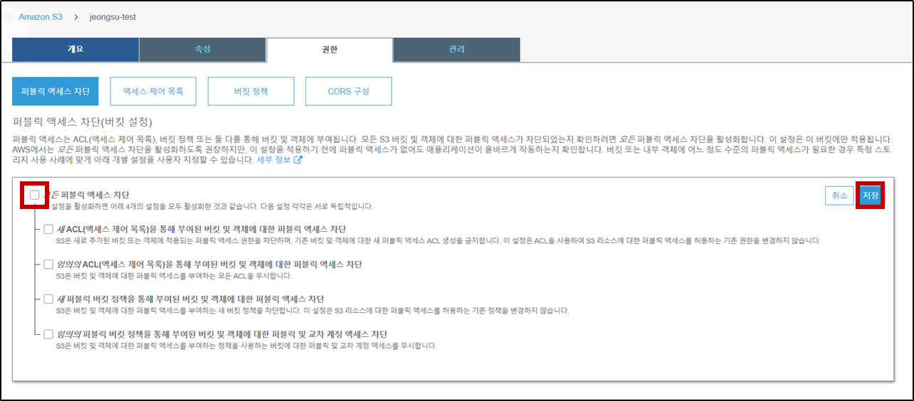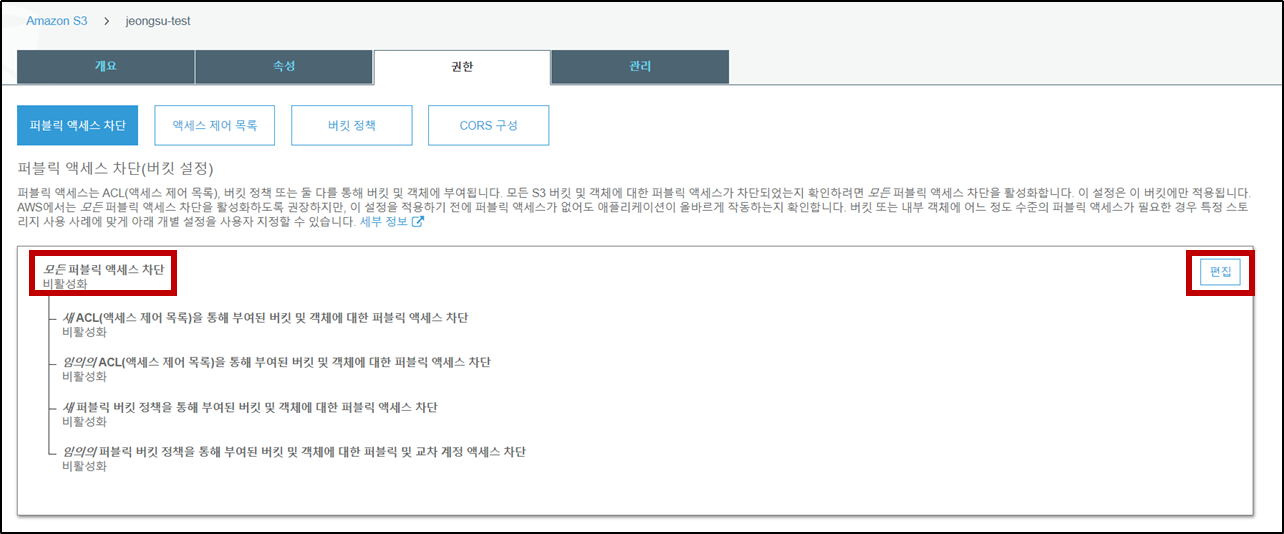 눌렀다면 여러분들은 모든 퍼블릭 액세스 차단이 활성화되어있을 것입니다.