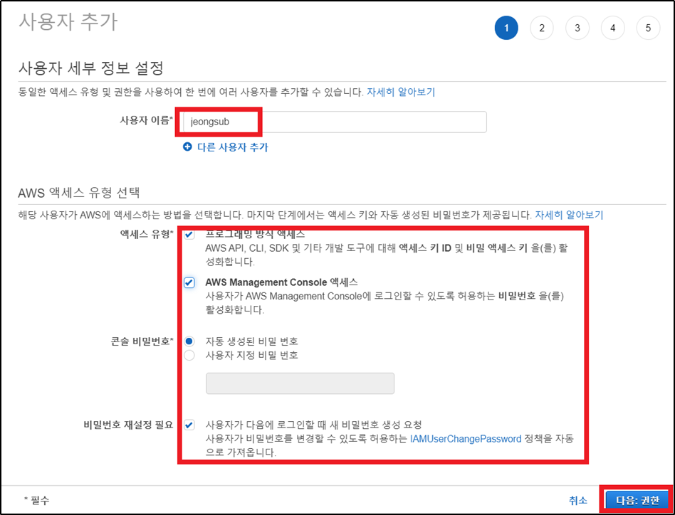 사용자 이름과 체크박스를 선택 후 다음으로 넘어갑니다.