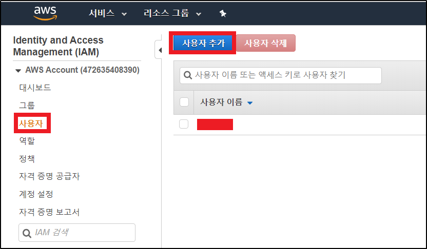 iam에 들어와 사용자를 눌러 사용자를 추가하여 줍시다. (저는 이미 한번 만들어서 목록에 사용자가 있어 화면은 다를 수 있습니다.
