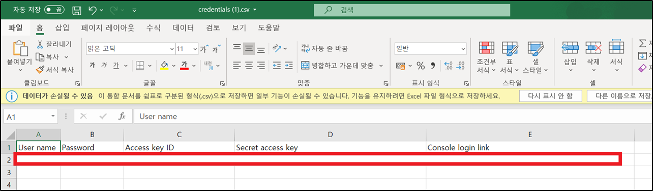 엑셀로 열어보면 저희가 사용에 필요한 access key와 secret key를 발급받은걸 확인할 수 있습니다.