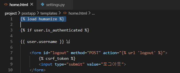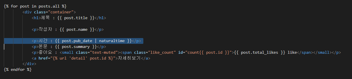 <p>시간 : {{ post.pub_date | naturaltime }}</p>