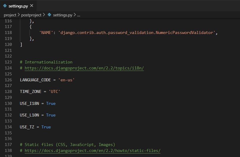 settings.py로 가서 120~~ 번 정도 되는 줄에 있을 것입니다. LANGUAGE_CODE와 TIME_ZONE를 조금만 수정해주면 됩니다.