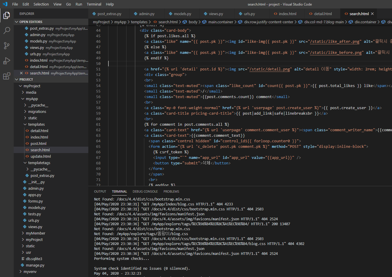 | Django로 홈페이지 만들기 - #5 글 수정, 글 삭제 (0) | 2020.05.04 |