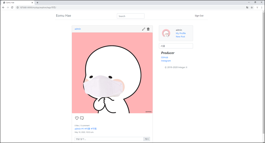 | Django로 홈페이지 만들기 - #9 hashtag, serach (2) | 2020.05.04 |