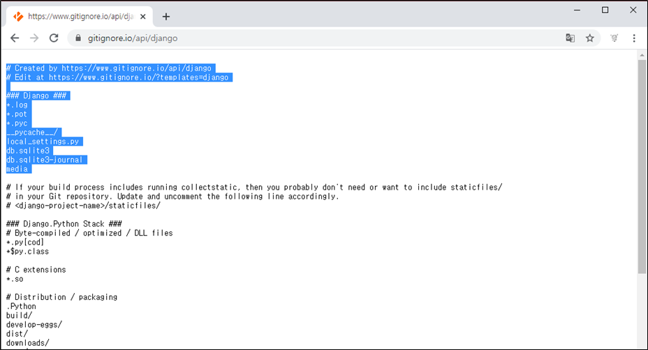 해당 사이트에 들어가 django를 검색하면 django에서 사용하기 앎자은 ignore를 추천해준다.