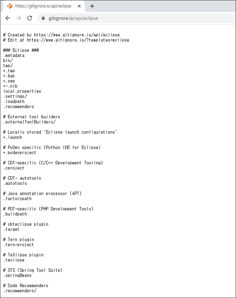 모두 복사하여 git에 있는 .gitignore 파일에 붙여준다.