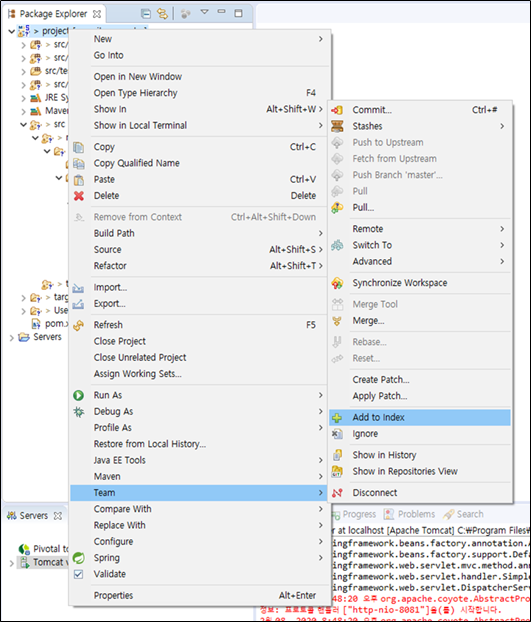 이제 다시 한번 프로젝트를 우클릭하여 Team에 여러 가지 메뉴가 생긴 모습을 볼 수 있을 것입니다.