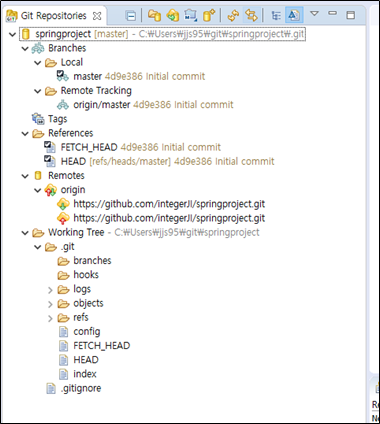 그러면 좌측 비어있던 깃에 저희 springproject가 생겼습니다 ( 로컬에 저장할 때의 경로 이름 )
