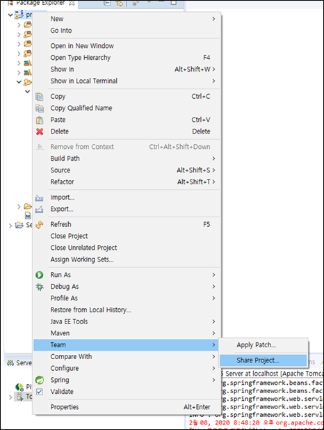 만든 프로젝트 우클릭 후 Team -> Share Project를 눌러줍니다.