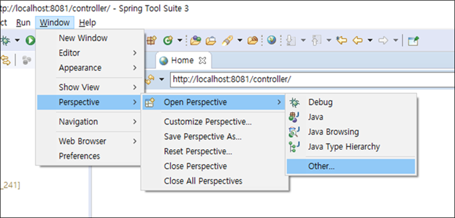 sts 상단에 Window -> Perspective -> Open Perspenctive -> Other을 눌러줍니다.