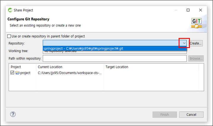 그러면 Share Project창이 새로 생깁니다. 여기서 Repository를 설정해 주어야 하는데