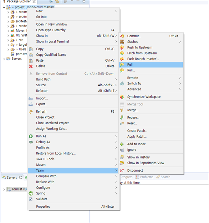 자신의 프로젝트 우클릭 -> Team -> Pull을 눌러줍니다.