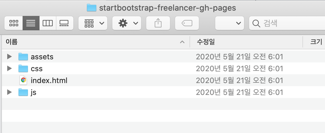 압축을 풀면 사진처럼 assets, css, js, index.html이 있습니다.