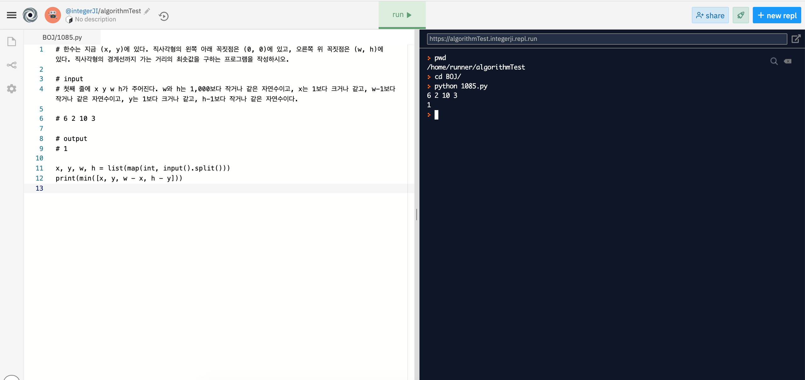 BOJ 폴더로 이동 후 python 파일인 1085.py 실행