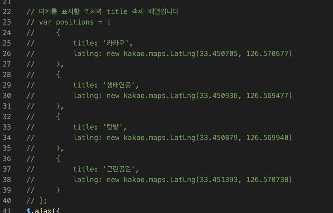기존 소스입니다. 24 ~ 40 line를 실행시킨 뒤 positions 배열에 데이터를 넣습니다. 하지만 ajax안에서만 배열이 추가 되고 막상 선언된 positions에는 추가되지 않습니다. 그럴땐 ajax가 끝나기 전에 async: