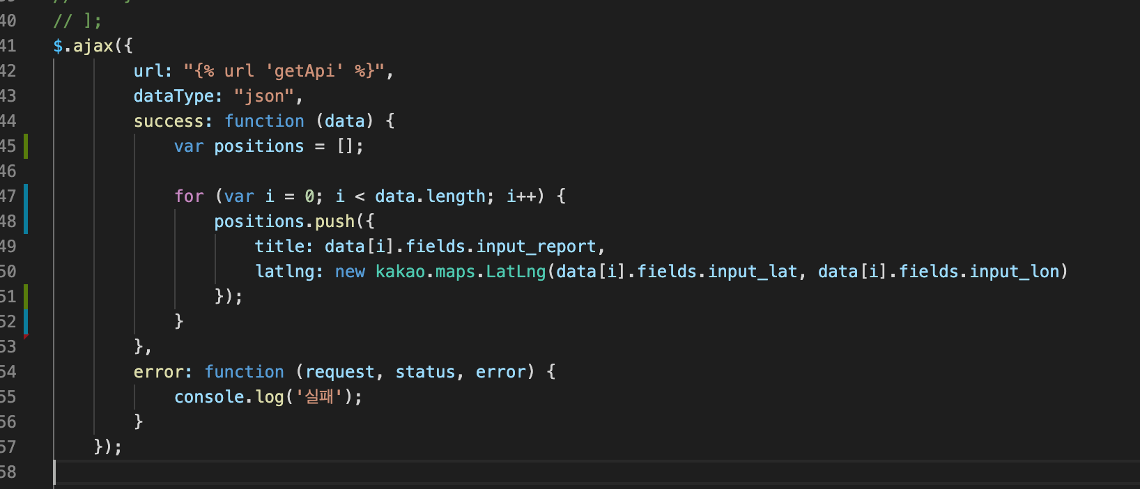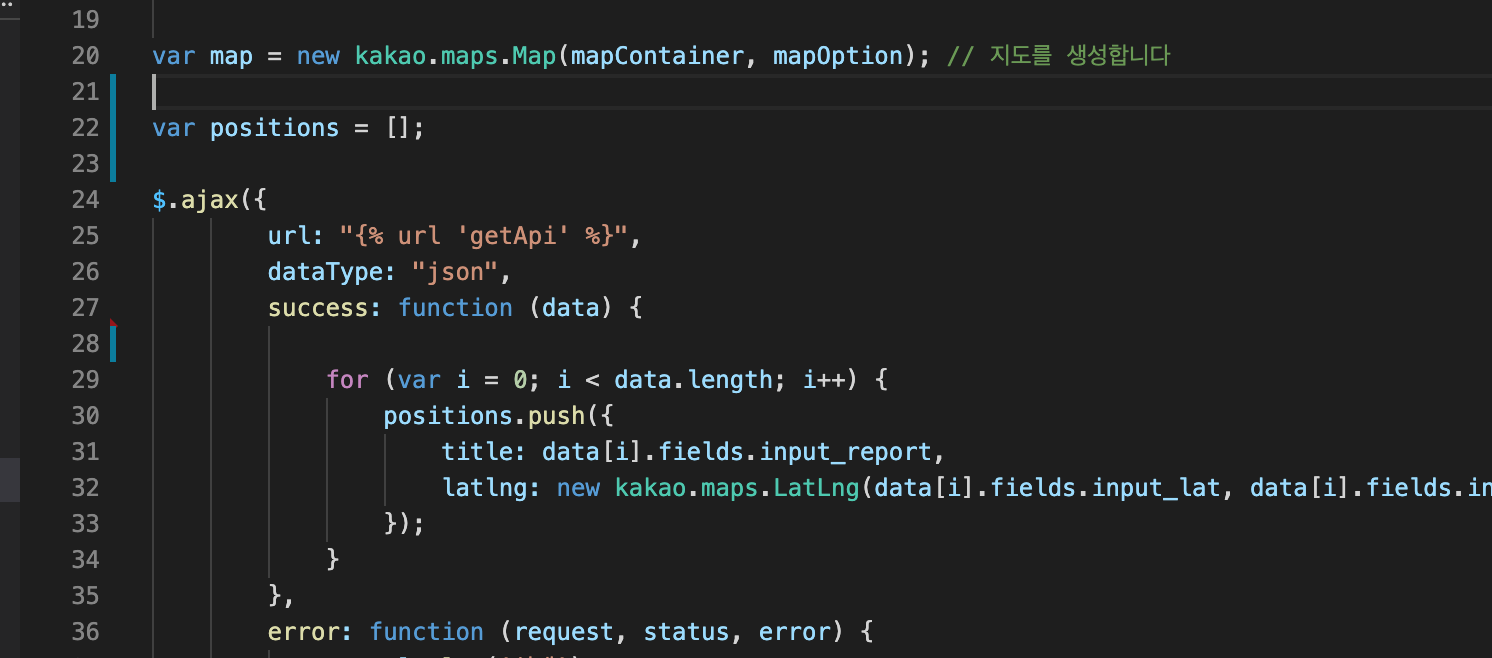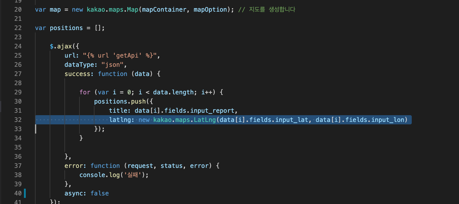 기존 소스입니다. 24 ~ 40 line를 실행시킨 뒤 positions 배열에 데이터를 넣습니다. 하지만 ajax안에서만 배열이 추가 되고 막상 선언된 positions에는 추가되지 않습니다. 그럴땐 ajax가 끝나기 전에 async: