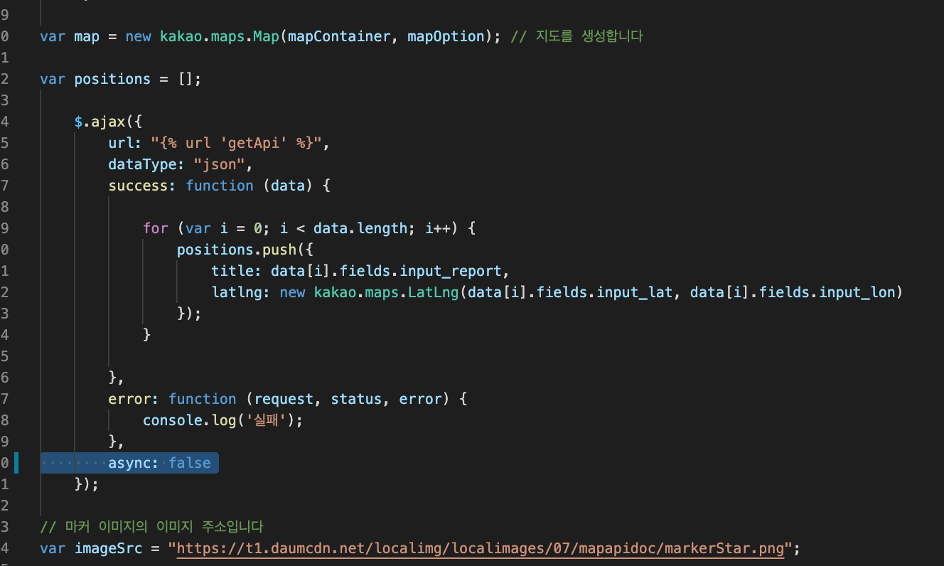 ajax가 끝나기 전에 async: false 처리를 하여 비동기화 해주어야