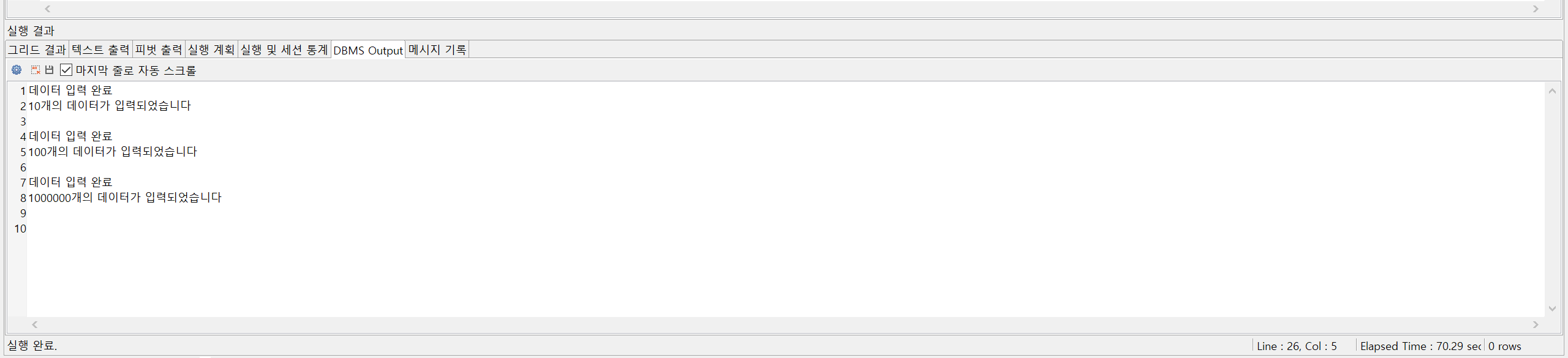 declare v_cnt number := 1; -- 시작 begin DBMS_OUTPUT.enable;WHILE v_cnt < 1000000 LOOP -- 1000000 미만까지 LOOP insert into -- INSERT문 TEST_TABLE ( TEST_ID, TEST_TITLE, TEST_DATE ) values ( v_cnt, -- PK값 증가 'test', sysdate ); v_cnt := v_cnt + 1;EXIT -- 값 증가 when v_cnt > 1000000; -- 1000000 미만까지 end LOOP; DBMS_OUTPUT.PUT_LINE('데이터 입력 완료'); DBMS_OUTPUT.PUT_LINE(v_cnt || '개의 데이터가 입력되었습니다'); end;