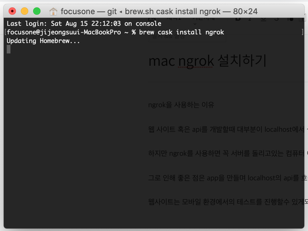 mac의 터미널을 실행시켜 해당 명령어를 이용해 ngrok를 설치합니다.