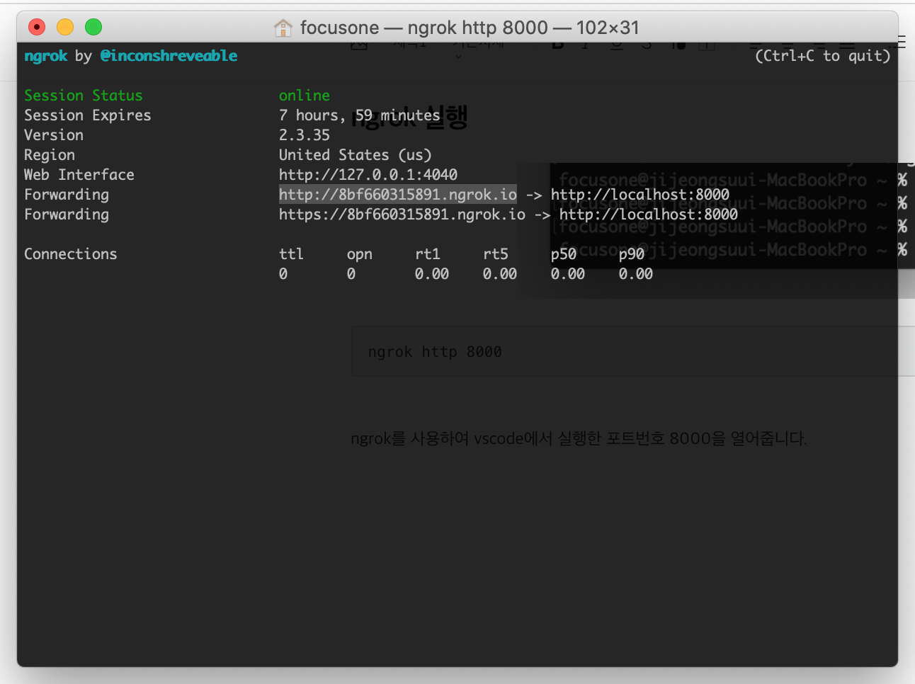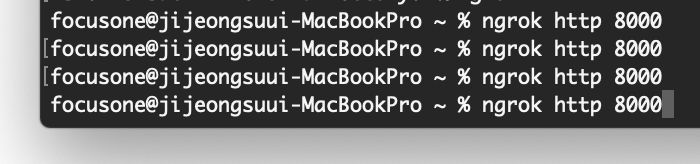 ngrok를 사용하여 vscode에서 실행한 포트번호 8000을 열어줍니다.