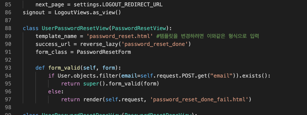 form_class : form을 불러와 넣어준다. import 해준 form 중 PasswordResetForm