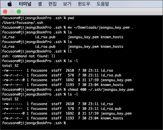 터미널을 열어 키 페어를 ~/.ssh폴더로 이동하여 줍니다.