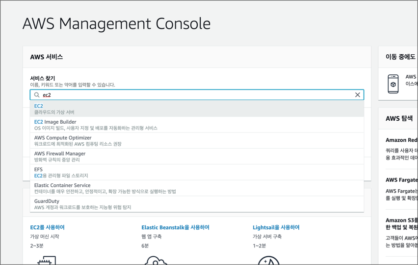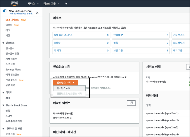 지역을 확인하고 AWS 서비스 중 ec2를 입력해 클릭