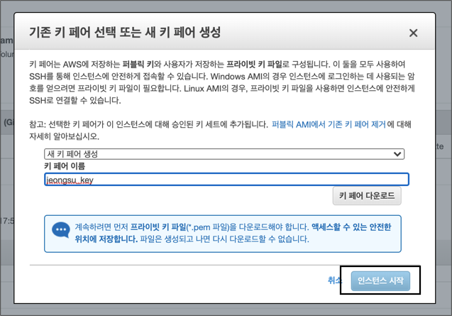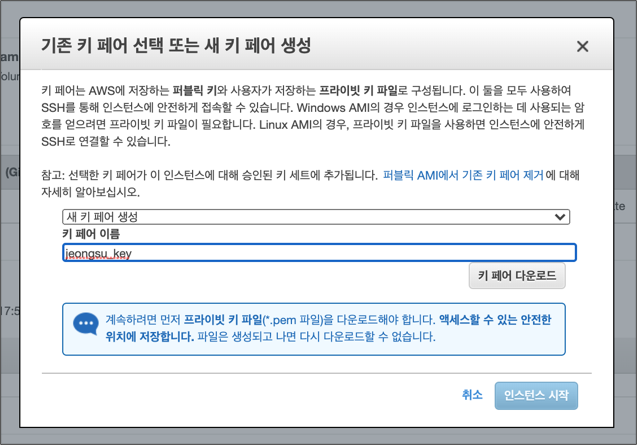 키 페어는 새로 만드는 인스턴스 서버의 키라고 생각하면 됩니다. (절대 보안)