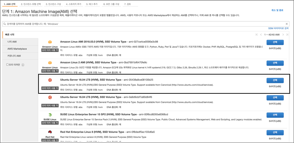 리눅스 운영체제 기반인 Ubuntu Server 18.04 LTS (HVM), SSD Volume Type를 선택하여 줍니다.