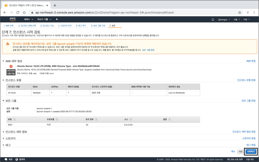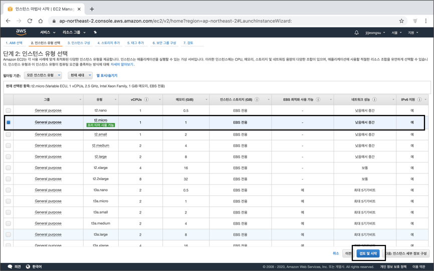 t2.micro 선택 후 바로 검토 및 시작을 눌러주세요.