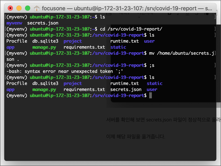 mv 명령어를 사용해 /home/ubuntu 폴더에 있는 secrets.json 파일을 . (현재위치)로 가져옵니다.