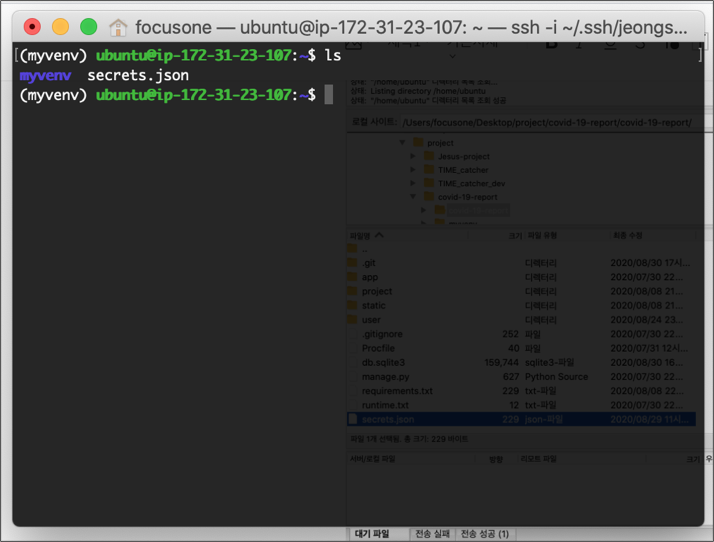 전송이 끝나면 ec2 서버를 확인해 보면 secrets.json 파일이 잘 이동된 모습을 볼 수 있습니다.