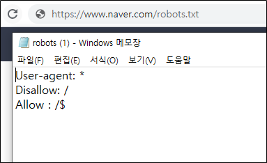 크롤링을 하려는 사이트 뒤에 /robots.txt를 붙여줍니다.