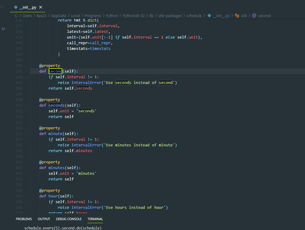 경로 : "C:\Users\사용자이름\AppData\Local\Programs\Python\Python38-32\lib\site-packages\schedule\__init__.py"