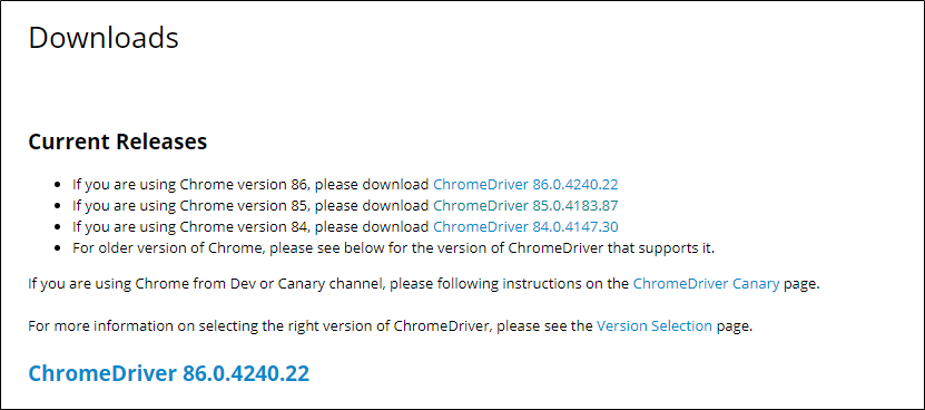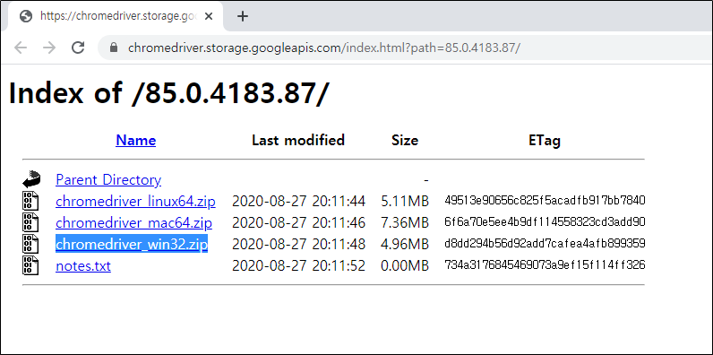이제 해당 사이트 sites.google.com/a/chromium.org/chromedriver/downloads에서 웹 드라이버를 다운받아 줍니다.