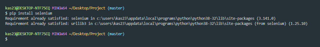 pip를 이용해 selenium을 설치하여 줍니다. (저는 이미 설치하였습니다.)