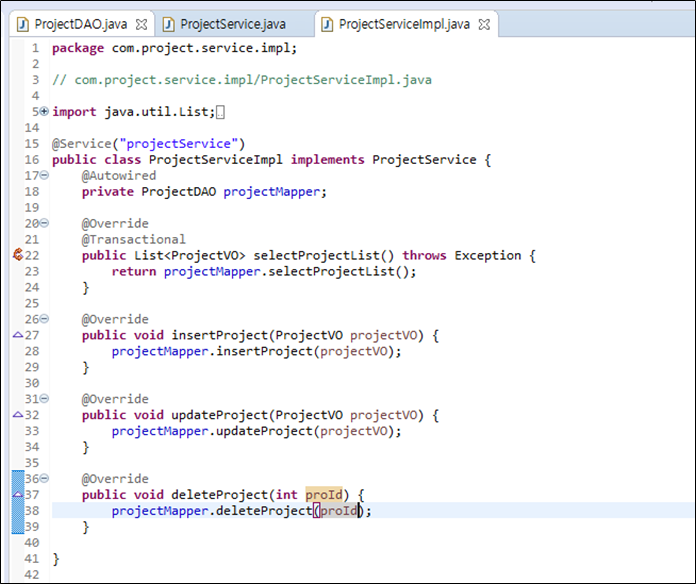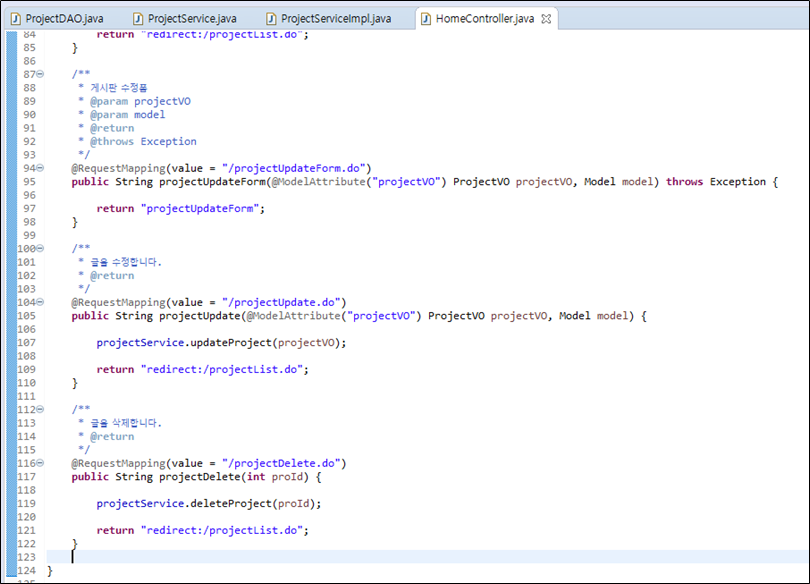 Delete문을 사용하며 insert, update와 다른 점은 projectVO의 모든 값을 넘겨주는 것이 아닌.