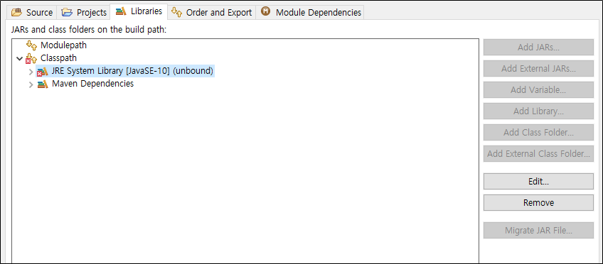 Project를 우클릭 해준 뒤 "Build Path" -> "Configure Build Path..." 클릭