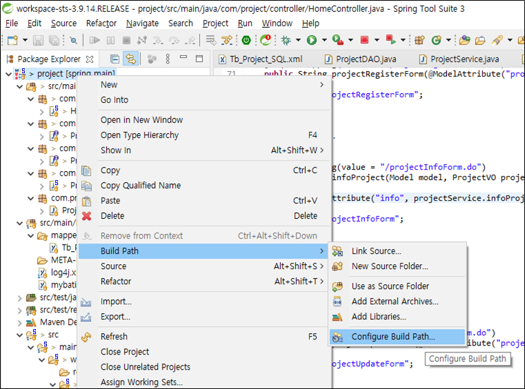 Project를 우클릭 해준 뒤 "Build Path" -> "Configure Build Path..." 클릭