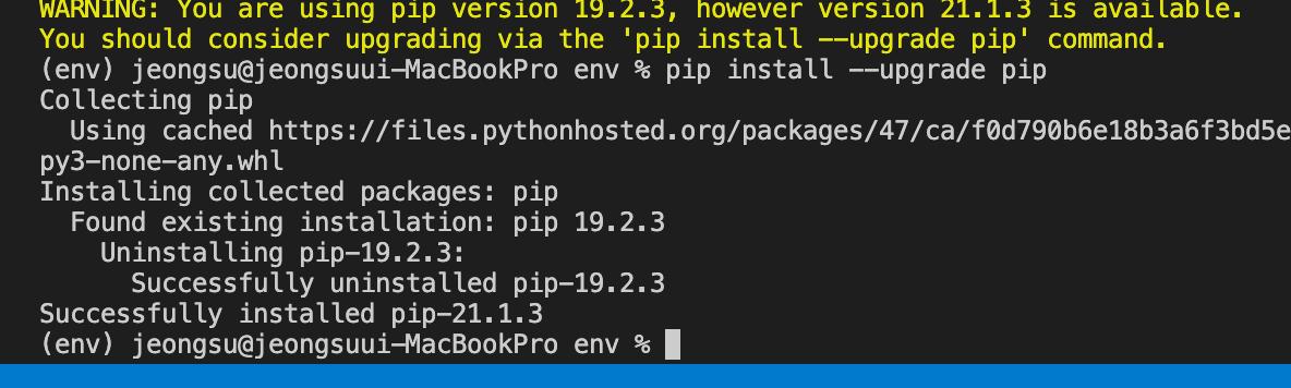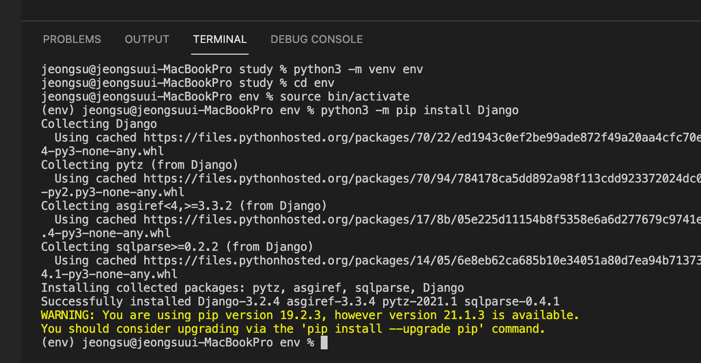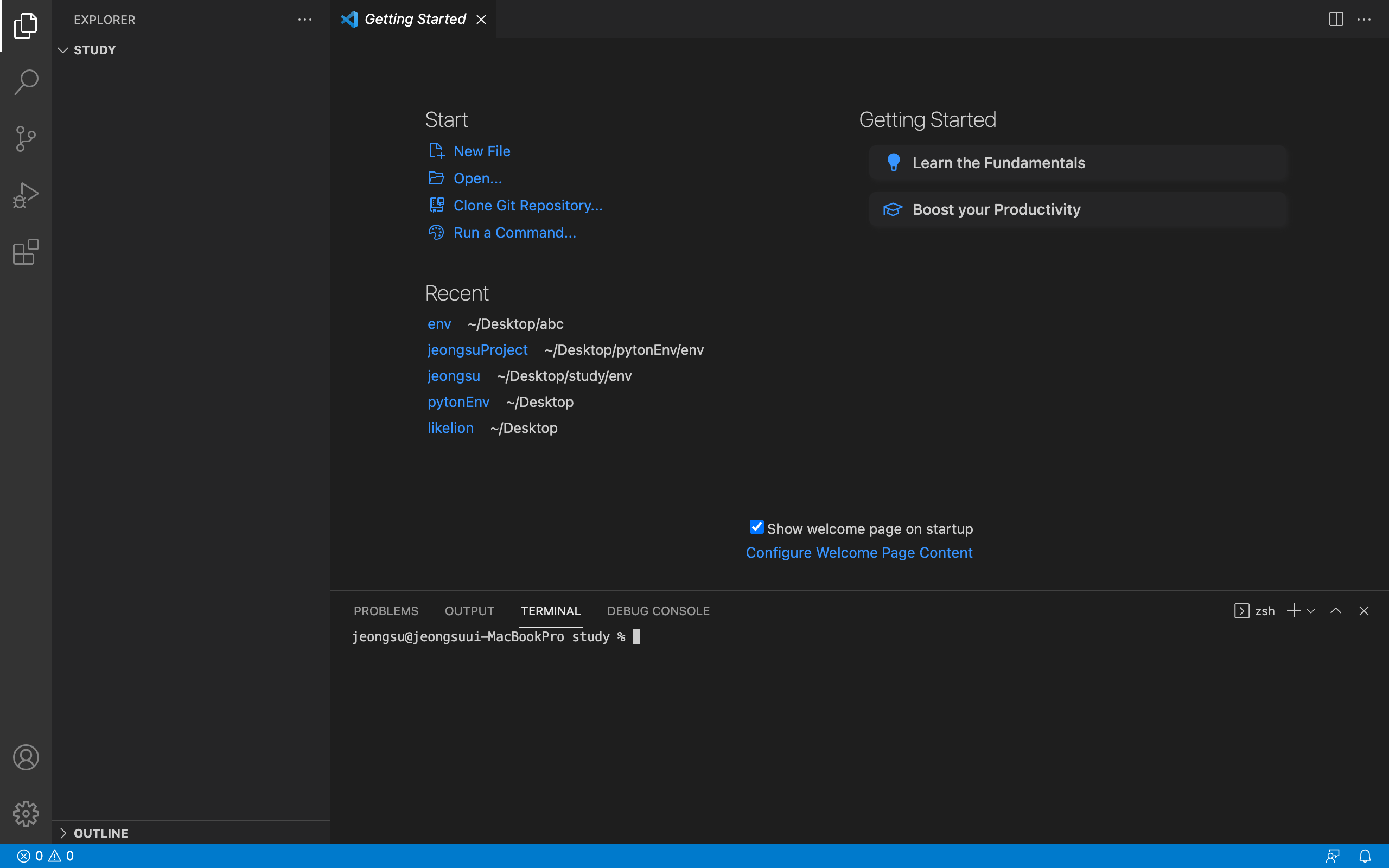 새로운 터미널을 열면 가상환경이 자동으로 실행되는 모습을 볼 수 있습니다.
