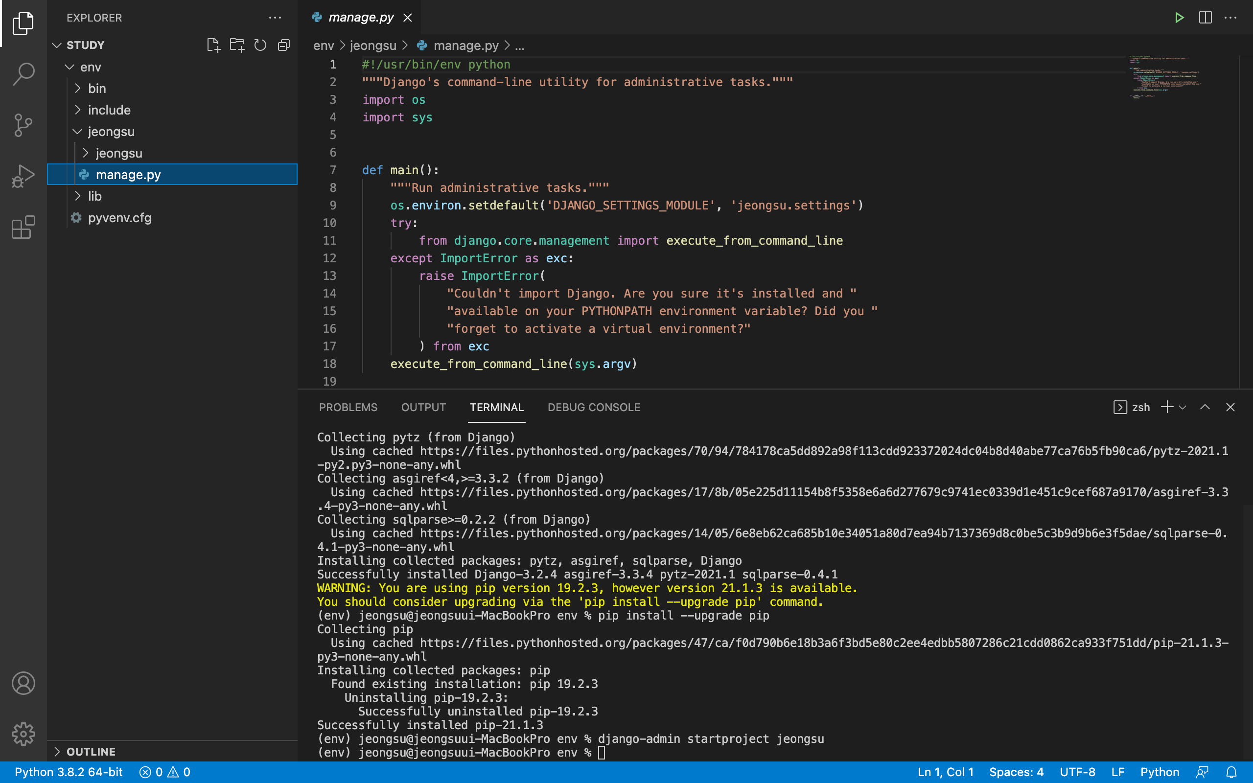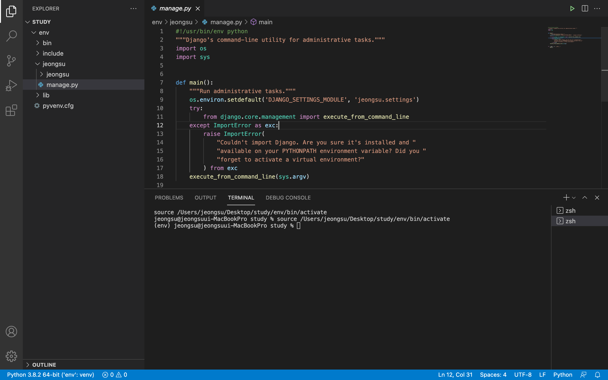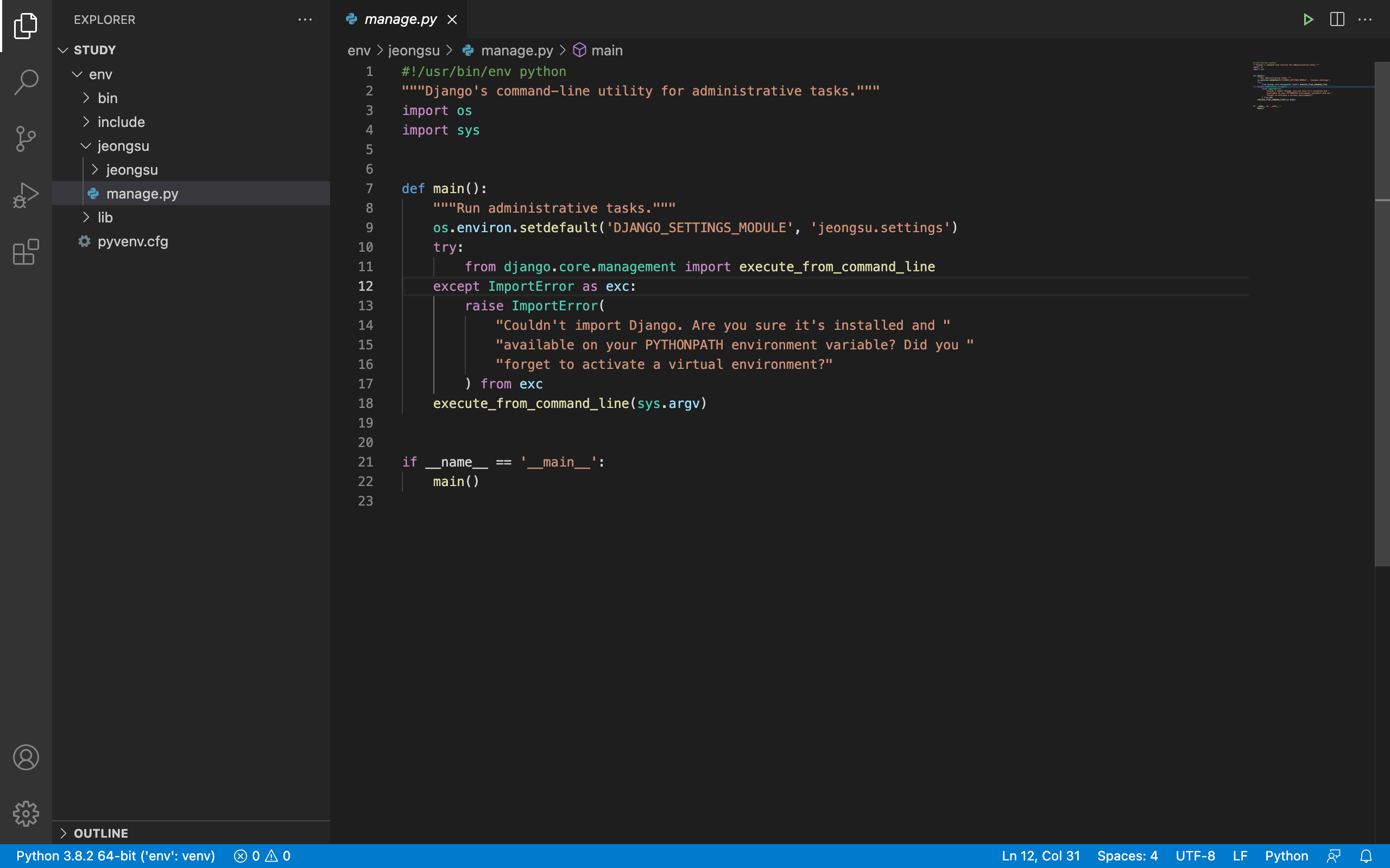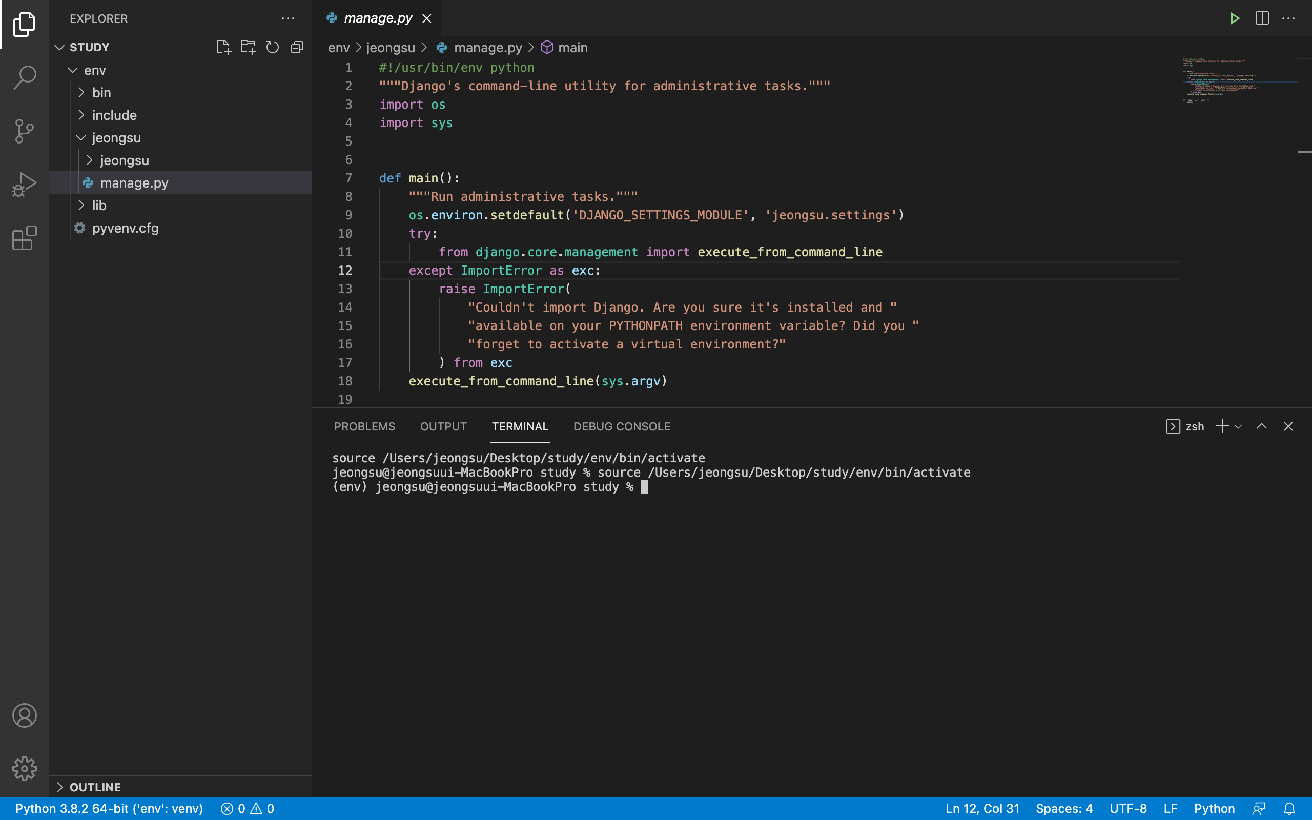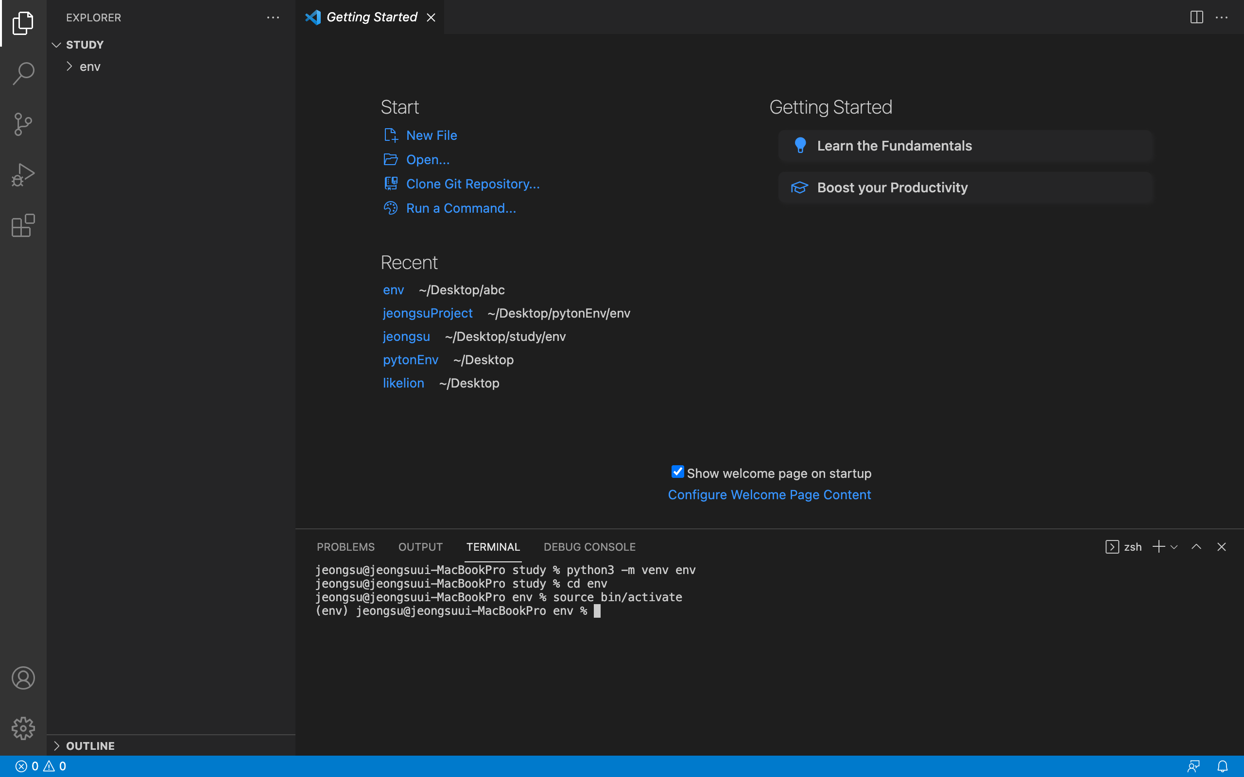 vscode를 다시 실행하게 되어도 우측 하단을 보면 'env':venv를 사용하는 것을 확인할 수 있으며