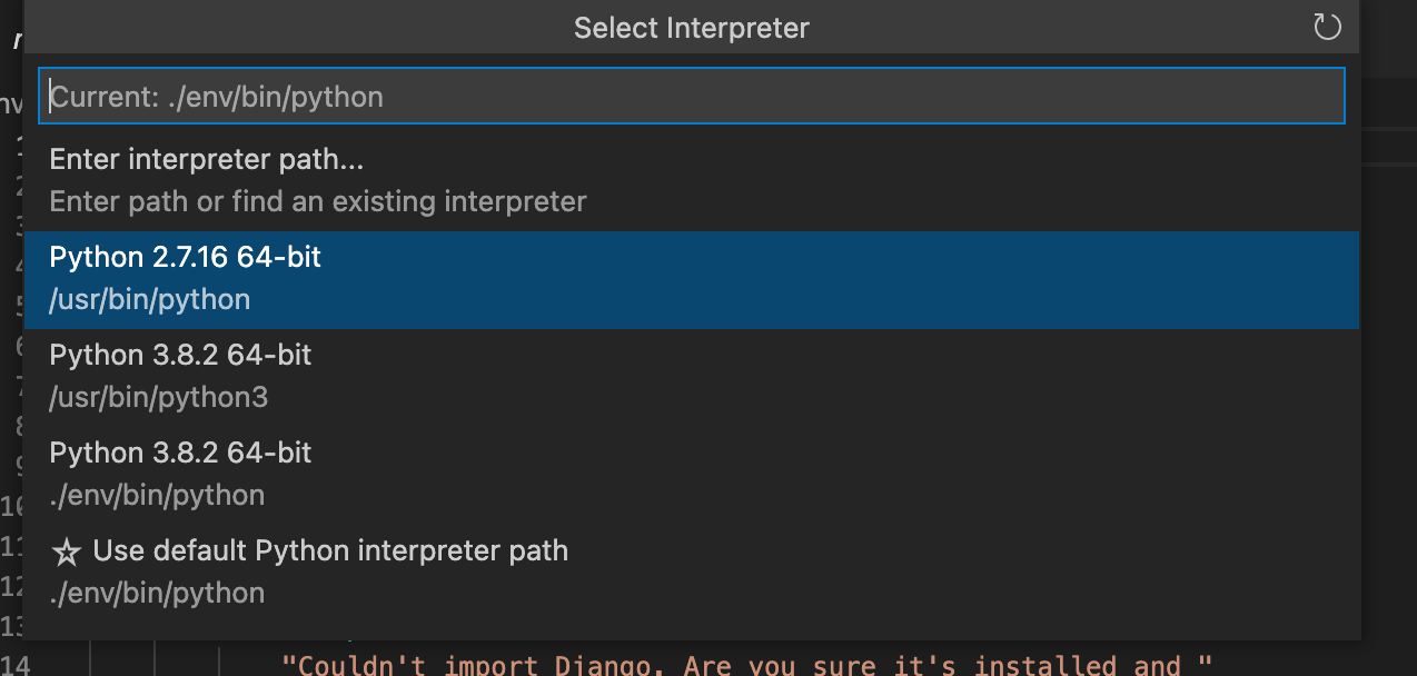 python의 설정 경로가 "Current: ./env/bin/python"으로 되어있으며