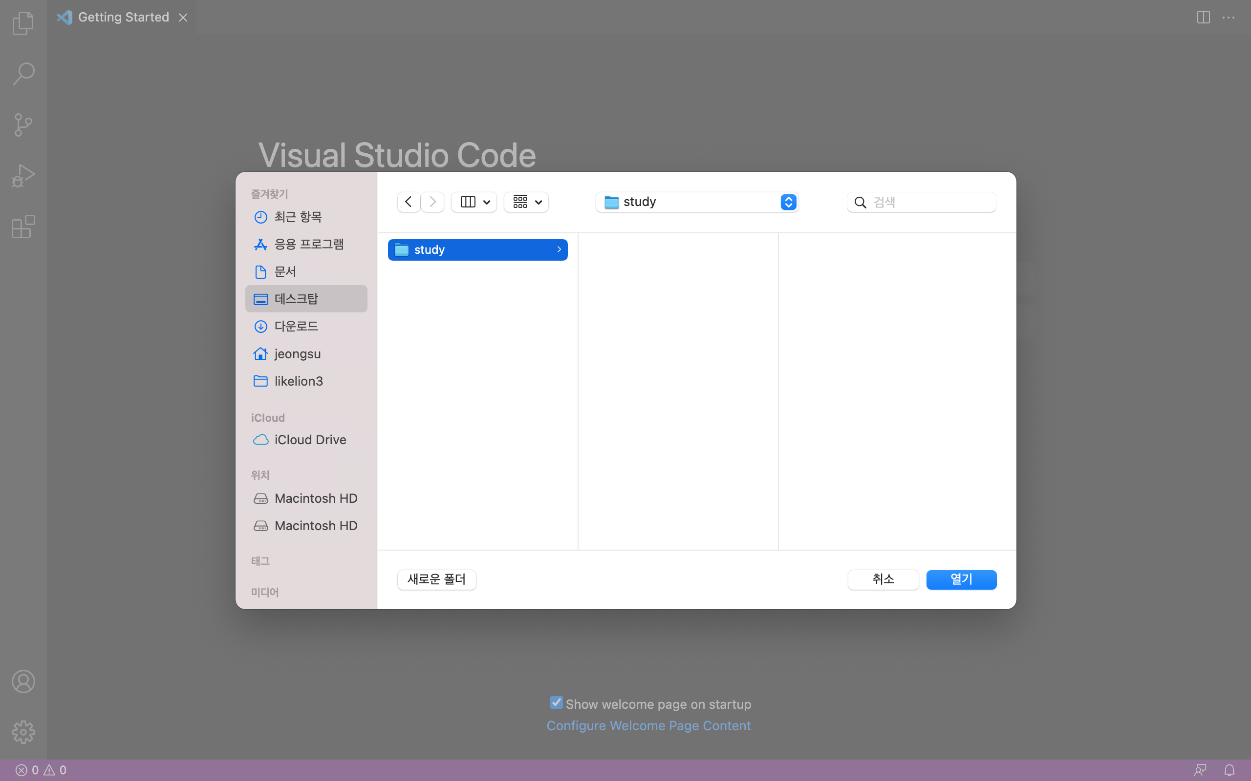 vscode를 실행하여 폴더를 선택해 줍니다.