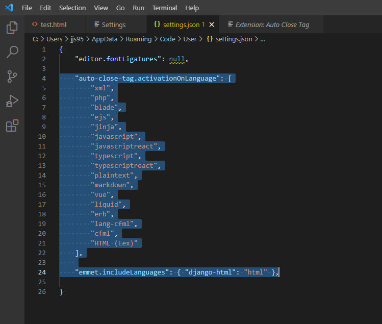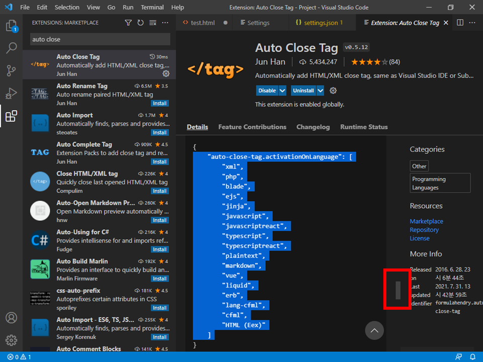이제 위에서 복사 한 "auto-close-tag.activationOnLanguage"와 추가 설정을 붙여 넣어 줍니다.